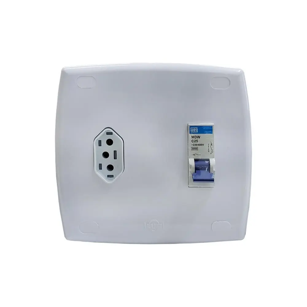 Caixa de Embutir é a solução ideal para instalações elétricas de aparelhos de ar-condicionado. Com design compacto e acabamento branco, ela integra uma tomada de 20 amperes e um disjuntor bipolar de 25A, oferecendo segurança e praticidade no acionamento direto do equipamento.